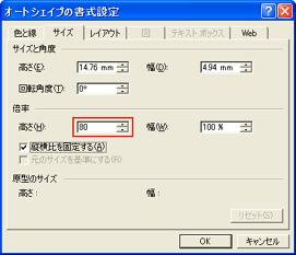 [オートシェイプの書式設定]画面で、[サイズ]タブをクリックし、[縦横比を固定する]にチェックを入れ、[倍率]の[高さ]で「80」と入力し、[OK]をクリック