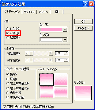 [グラデーション]タブの[色]で[2色]をクリックし、[色1]で[ローズ]、[色2]で[白]を選択し、[OK]をクリック