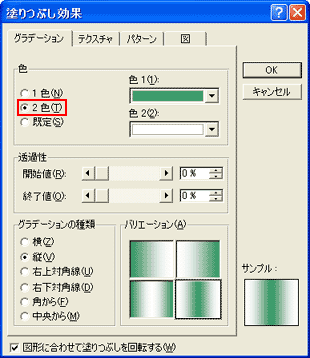 [グラデーション]タブの[色]で[2色]をクリックし、[色1]で[シーグリーン]、[色2]で[白]を選択
