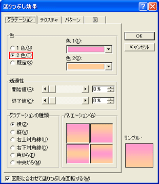 [グラデーション]タブの[色]で[2色]をクリックし、[色1]で“ローズ”、[色2]で“ベージュ”を選択し、[OK]をクリック