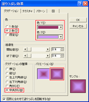 [グラデーション]タブの[色]で[2色]をクリックし、[色1]で[プラム]、[色2]で[ラベンダー]をクリック