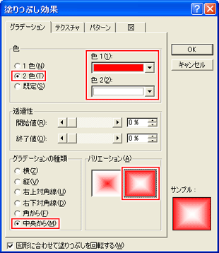[グラデーション]タブの[色]で[2色]をクリックし、[色1]で[赤]、[色2]で[白]をクリック