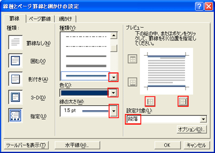 [設定対象]が[段落]になっていることを確認し、[種類]の[▼]をクリックして設定したい罫線をクリック