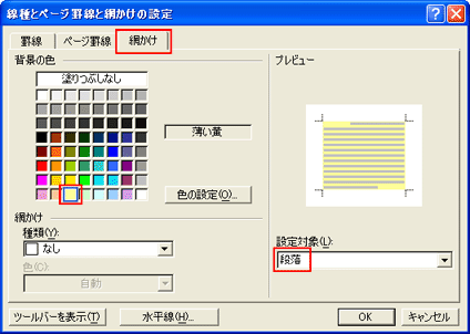 [網かけ]タブをクリックし、[設定対象]が[段落]になっていることを確認し、[背景の色]で色を選ぶ。ここでは、「薄い黄」を選ぶ