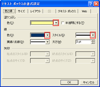[塗りつぶし]の[色]の[▼]をクリックし、背景色を選択する。ここでは、「薄い黄」を選ぶ