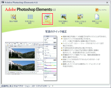 [スタートアップスクリーン]画面で、[写真のクイック補正]をクリック