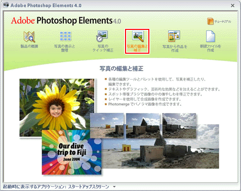 [スタートアップスクリーン]画面で、[写真の編集と補正]をクリック