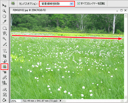 カンバスオプションの[▼]をクリックし、[背景領域を削除]をクリックして選択する