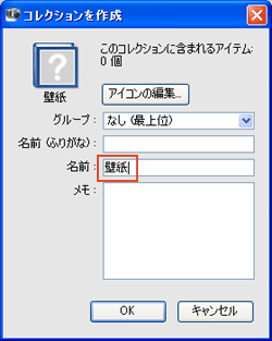 (新規作成)→[新規カテゴリー]をクリックし、[カテゴリーを作成]画面で[ふりがな]欄に[かべがみ]、[カテゴリー名]欄に[壁紙]と入力し、カテゴリーアイコンを選択して[OK]をクリックします。