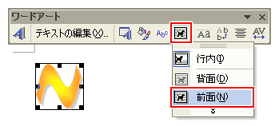 [ワードアート]ツールバーの[テキストの折り返し]をクリックし、[前面]をクリック