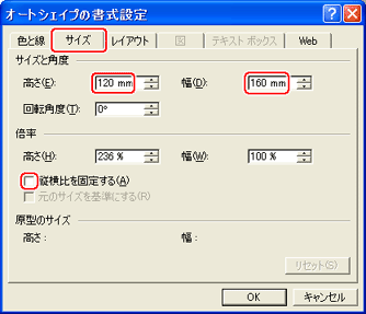 [高さ]を[120]mm、[幅]を[160]mmと入力する