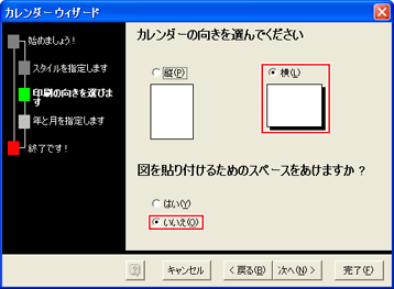 ここでは、[横]をクリックして選択し、[図を貼り付けるためのスペースをあけますか?]で[いいえ]が選択されていることを確認し、[次へ]をクリック。
