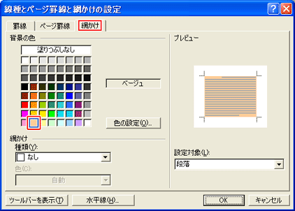 [網かけ]タブをクリックし、[背景の色]で色を選択し、[OK]をクリック