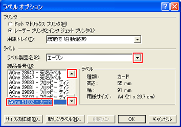 お使いのカード紙の製品名、製品番号を[ラベル製品名]、[製品番号]の[▼]をクリックして選択し、[OK]をクリック