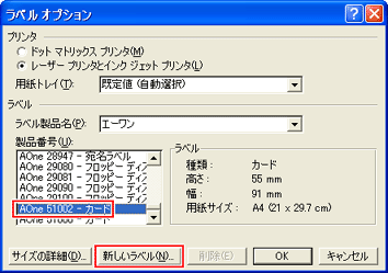 [ラベル製品名]で[エーワン]、[製造番号]で[AOne 51002−カード]を選択し、[新しいラベル]をクリック