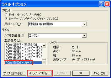 [ラベル製品名]で[エーワン]、[製造番号]で[AOne 51006−カード]を選択し、[新しいラベル]をクリック