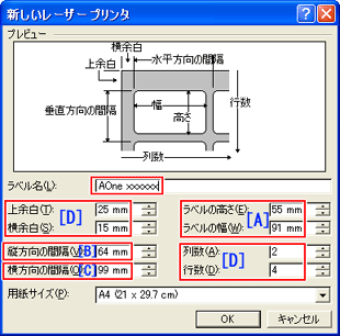 [横方向の間隔]を入力する。 [横方向の間隔](プレビューでは「水平方向の間隔」)は、「ラベルの幅」と「横のラベル間の余白」を足した数値となる