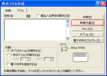 [宛名ラベル作成]画面で、[新規文書]をクリック