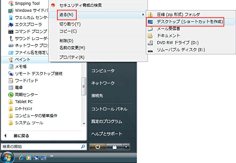 [送る]→[デスクトップ(ショートカットを作成)]をクリック