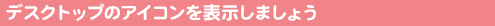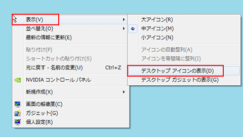 - デスクトップの何もないところで右クリックし、[表示] → [デスクトップ アイコンの表示]をクリックして、チェックを付ける。