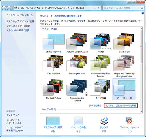 ウィンドウズ 7では、あらかじめ用意されているテーマのほかに、インターネットにあるテーマをダウンロードしてパソコンに取り込み、利用することができます。試してみましょう。 |