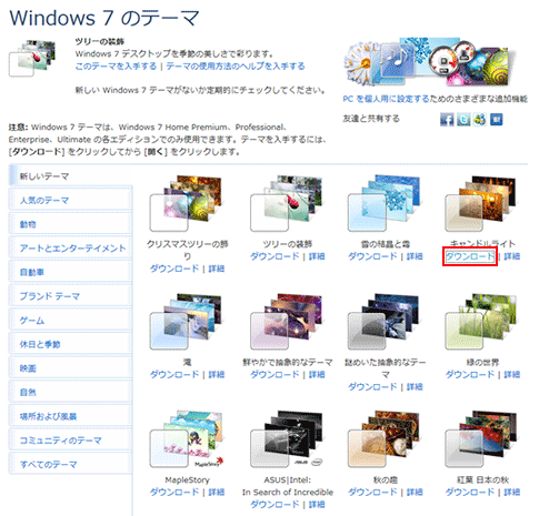 - インターネットに接続し、[Windows 7のテーマ]ページが表示されたら、好みのテーマの[ダウンロード]をクリック
