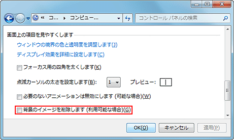 - [コンピューターを見やすくします]画面で、[画面上の項目を見やすくします]の[背景のイメージを削除します(利用可能な場合)]のチェックを外す