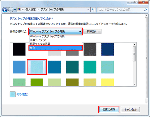 - [デスクトップの背景]画面で、[画像の場所]欄から[単色](純色)を選択