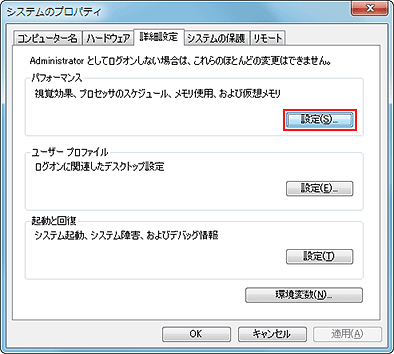 - [システムのプロパティ]画面の[詳細設定]タブで、[パフォーマンス]の[設定]をクリック