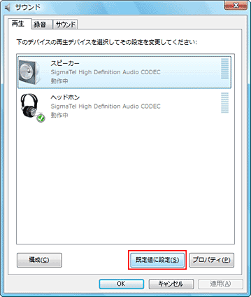 パソコンによっては、ヘッドホンとスピーカーのどちらかから音声を再生できるものがあります。ヘッドホンを接続するとヘッドホンから、外すとスピーカーから再生されます。Windows Vistaで聴きたい装置をどちらか一方に指定する場合は、既定値に設定しましょう。
