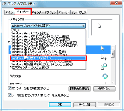 [マウスのプロパティ]画面で、[ポインター]タブをクリックし、[デザイン]欄で[Windows 反転色(システム設定)]などを選択する