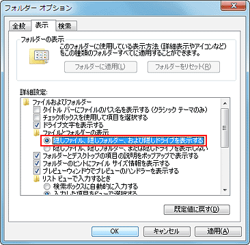 - [詳細設定]欄で、[ファイルとフォルダーの表示]の[隠しファイル、隠しフォルダー、および隠しドライブを表示する]をクリック。