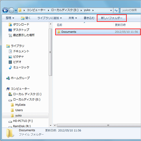 - ユーザー名フォルダーの画面で、[新しいフォルダー]をクリックし、「Documents」と入力し、[Enter]キーを押す