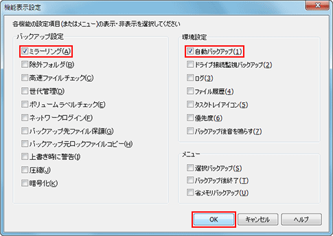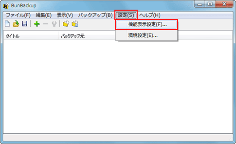 - [BunBackup]画面で、[設定] → [機能表示設定]をクリック