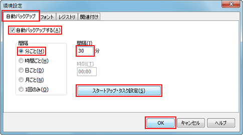 - [環境設定]画面の[自動バックアップ]タブで、[自動バックアップする]にチェックを入れる