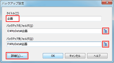 - [バックアップ設定]画面で、[タイトル]欄にバックアップするフォルダー名を入力する