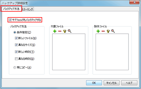 - [バックアップの詳細設定]画面の[バックアップ方法]タブで、[サブフォルダもバックアップする]にチェックを入れる