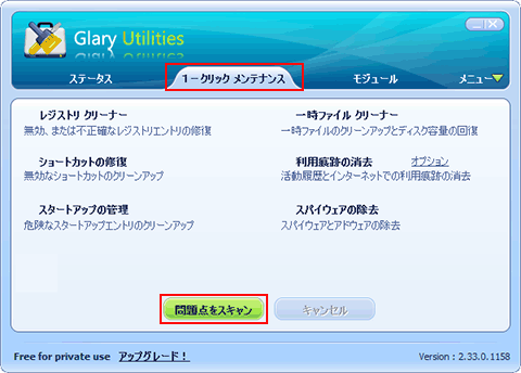 - [Glary Utilities]画面の[1-クリックメンテナンス]タブで、[問題点をスキャン]をクリック