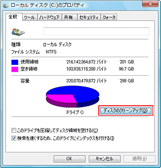 [削除するファイル]欄については、ディスククリーンアップをご覧ください。