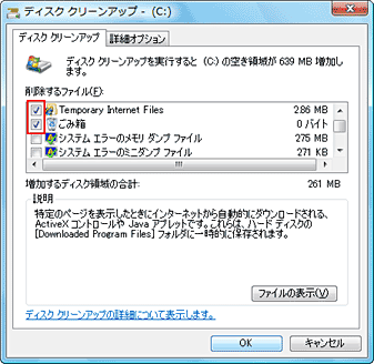 - [Temporary Internet Files]、[ごみ箱]、[一時ファイル]にチェックを入れる。ほかの項目にチェックを入れてもかまわない