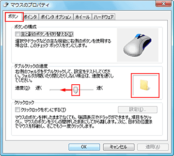 - [ボタン]タブの[速度](ダブルクリックの速さ)のつまみを左(遅く)にドラッグ