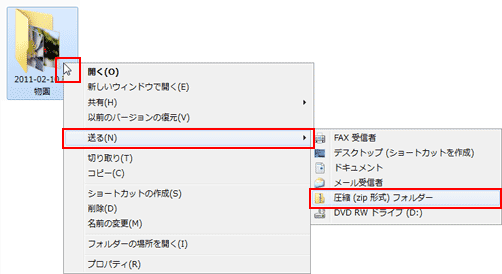 - フォルダーを右クリックし、[送る] → [圧縮(zip形式)フォルダー]をクリック