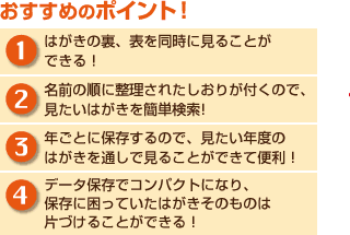 思い出を色あせることなくパソコンに保存できるので、はがきそのものは片づけることができます。